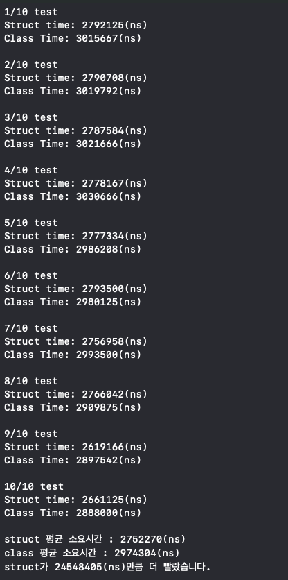 print("struct 평균 소요시간 : \(totalStructTime / 10)(ns)")