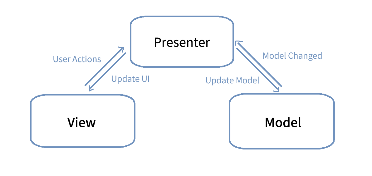 View는 Presenter에 대한 참조를 가지고 있고 Presenter는 View 인터페이스를 통해 View를 조작함