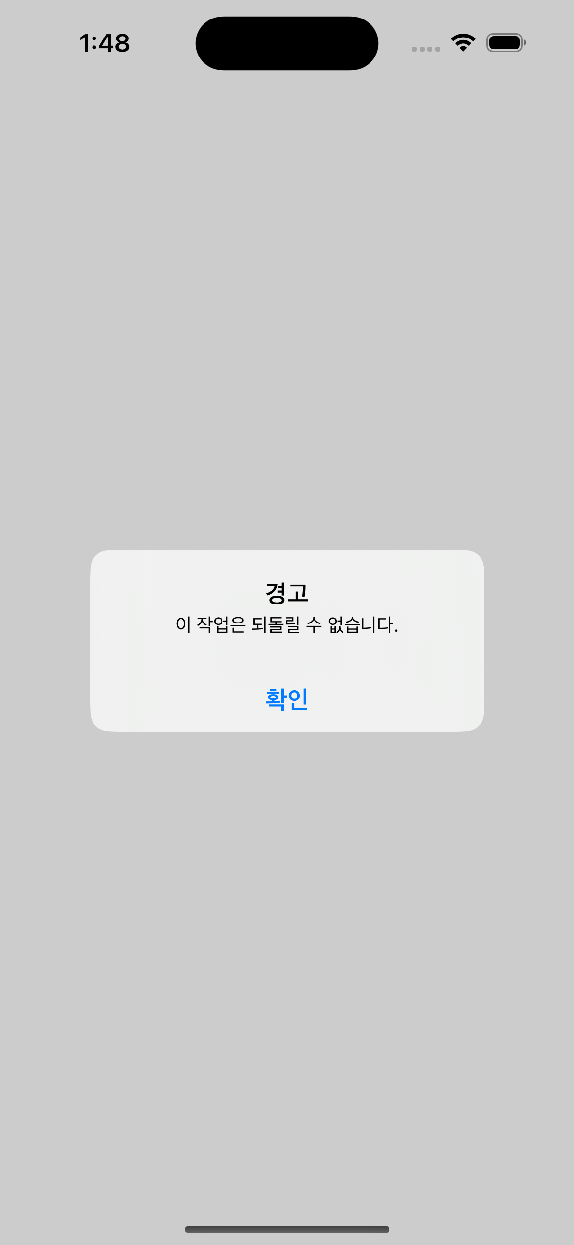 let alert = UIAlertController(title: "경고", message: "이 작업은 되돌릴 수 없습니다.", preferredStyle: .alert)
