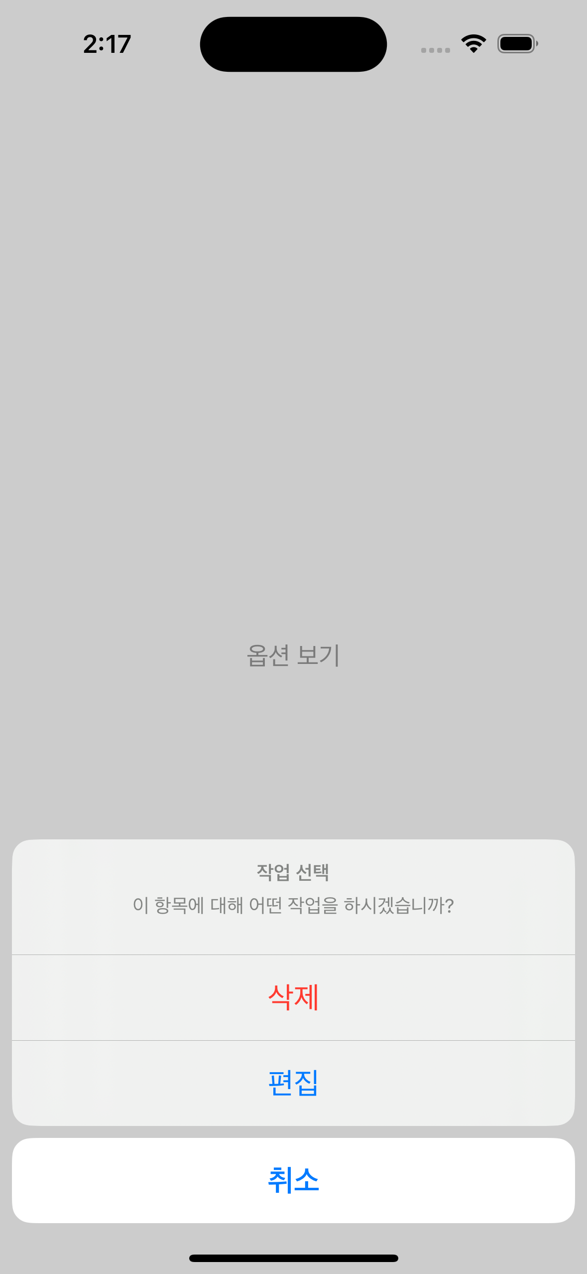 .confirmationDialog("작업 선택", isPresented: $showSheet, titleVisibility: .visible) {